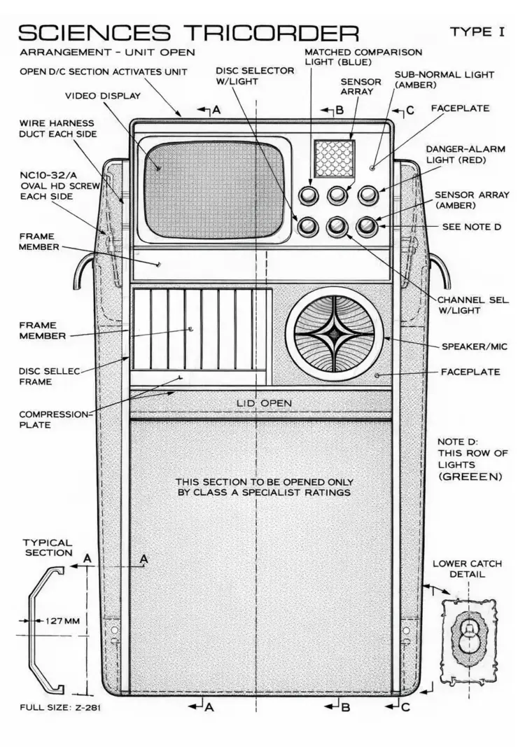 Fan art evolved to the point of speculating about the technical particulars of props from science fiction is found in this diagram from The Star Trek Star Fleet Technical Manual, by Franz Joseph, a technical artist and designer who worked during the day for General Dynamics.